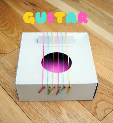 Nuestro primer instrumento es una guitarra. Sólo necesitamos una caja de cartón, semi blando, banditas elásticas, y chinches ( tachuelas o clips mariposa).... El detalle mas importante a tener en cuentas es hacer una especie de triángulo en la base para que las cuerdas queden suspendidas. -Ver primera imagen-